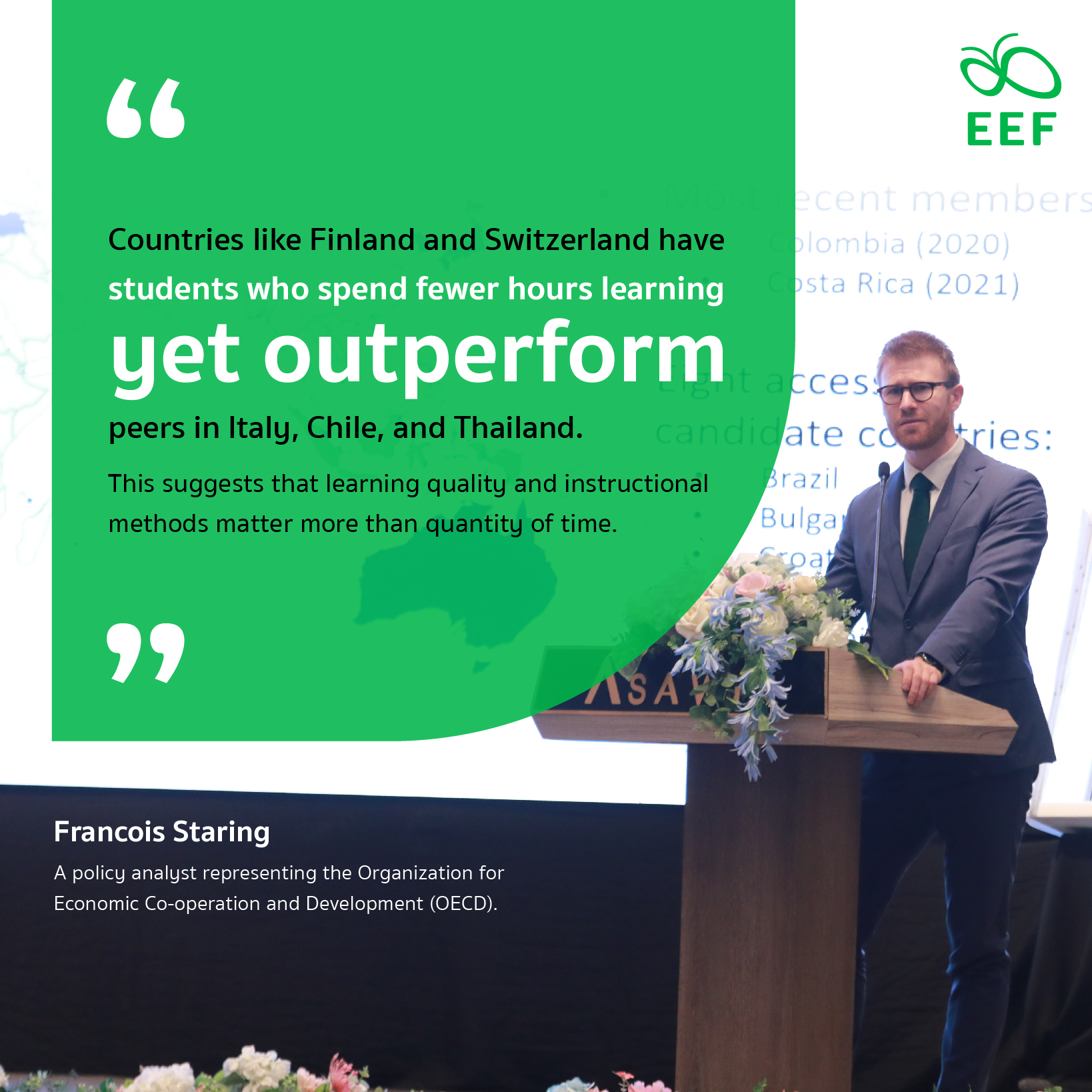Thailand’s collaboration with OECD has spanned decades. Since 2001, Thailand has participated in the Programme for International Student Assessment (PISA), which evaluates student performance in reading, mathematics, and science. The country also joined OECD’s recent survey on creativity and critical thinking in schools. In recent years, OECD’s support has deepened, notably through the publication of strategic reports on skills development. As OECD’s representative, Francois views this conference as a vital opportunity to learn about Thailand’s educational system, understand its challenges and needs, and help chart pathways for future improvement.
