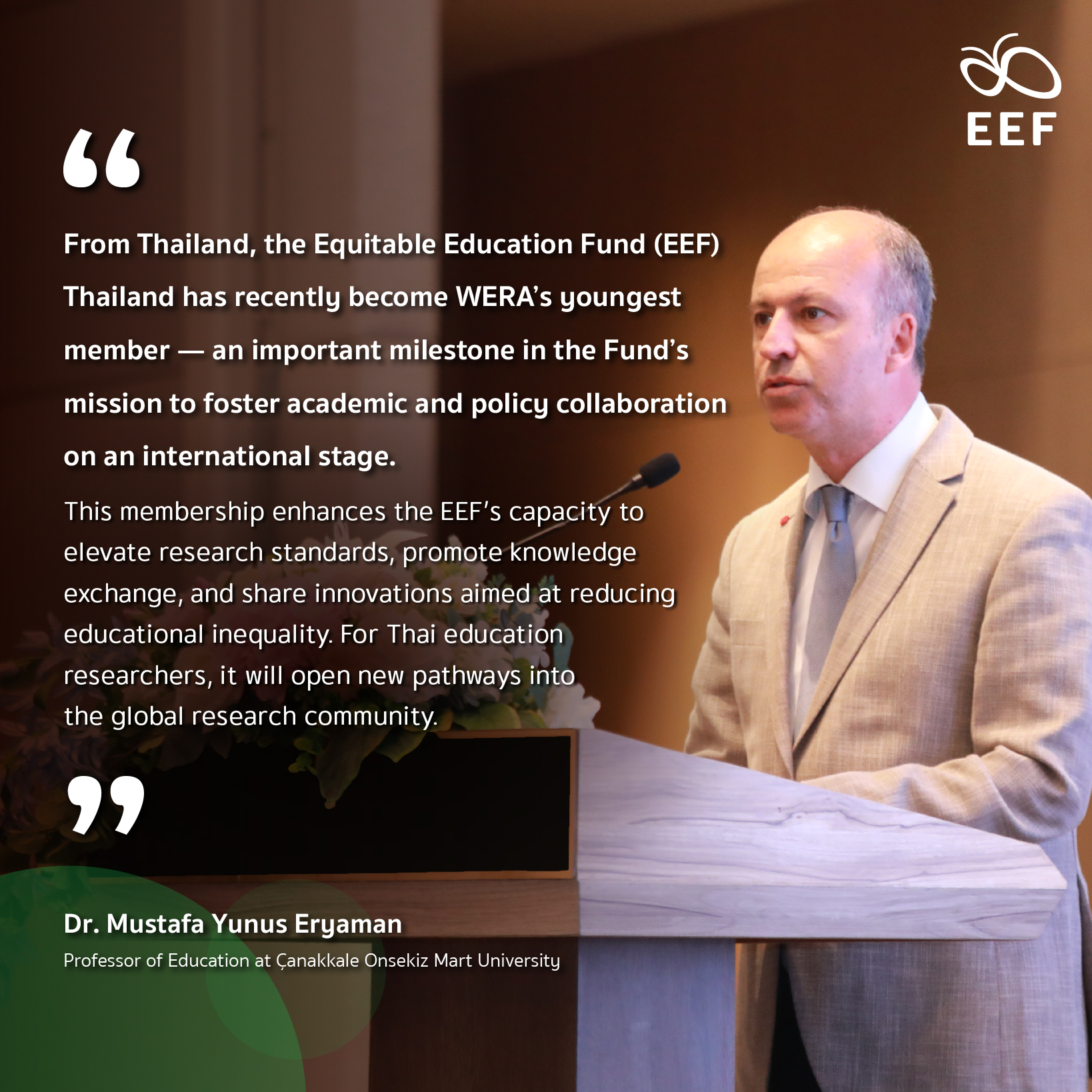 From Thailand, the EEF has recently become WERA’s youngest member—an important milestone in the Fund’s mission to foster academic and policy collaboration on an international stage. This membership enhances the EEF’s capacity to elevate research standards, promote knowledge exchange, and share innovations aimed at reducing educational inequality. For Thai education researchers, it will open new pathways into the global research community.