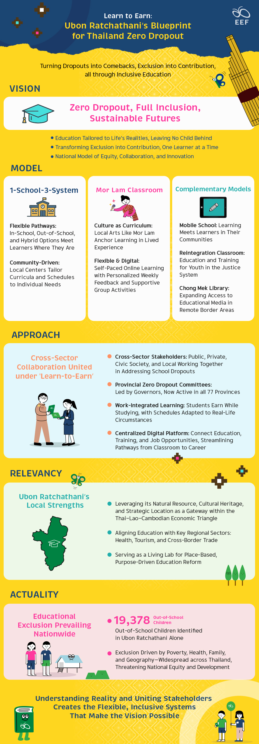 Championing this mission is the Equitable Education Fund (EEF)—a leading organization committed to advancing education equity and inclusion across Thailand—promoting innovative, learner-centered solutions rooted in “Learn to Earn.” Beyond traditional schooling, the EEF drives systemic change that is both scalable and deeply responsive to local diversity. For a proof so tangible, one should look no further than the success in Ubon Ratchathani: equity-focused policies, bolstered by collaboration and innovation, can dismantle obstacles and empower every child to realize their full potential. Through this, not only does the EEF not only fulfill its mandate, but it also sets a powerful national example, ensuring no learner is left behind and that every path forward is paved by the promise of learning while earning.