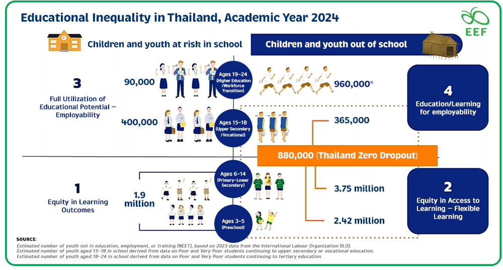 Building on that, Dr. Kraiyos drew a sobering connection between digital access and education. Today, 880,000 Thai children aged 3–18 remain out of school, completely disconnected from even basic learning. Of the country’s nearly nine million school-age children, around 10% have no access to education at all, making AI an almost unreachable concept. Unless educational inequity is addressed first, he argued, Thailand will struggle to seize the opportunities of the AI era.