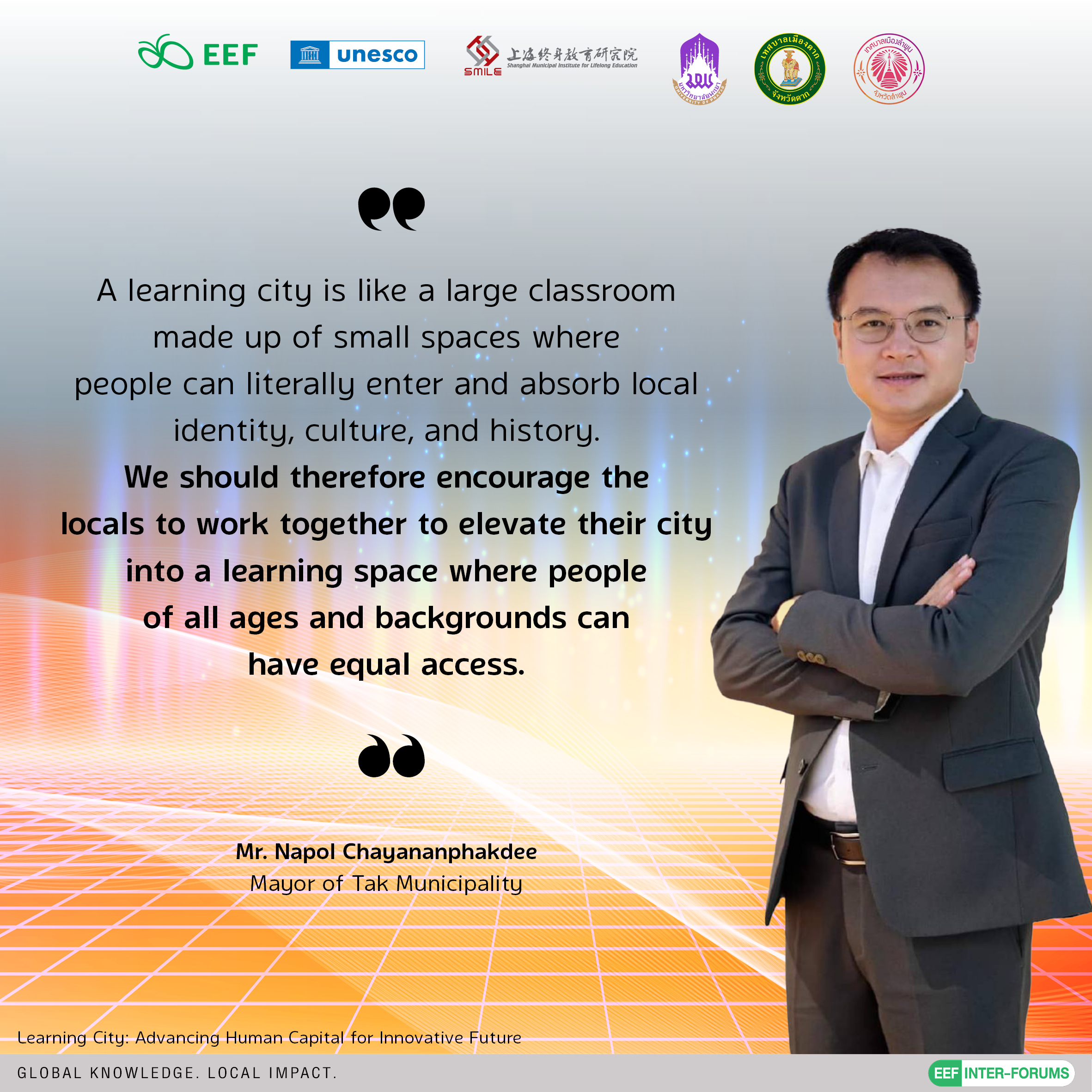 Speakers include Dr. Rika Yorozu, Education Programme Specialist, UNESCO Regional Office in Bangkok and Office for UN Coordination for Asia and the Pacific, Prof. Dr. Jiacheng Li, Executive Vice President and Professor, Shanghai Municipal Institute for Lifelong Education (SMILE), East China Normal University, Praphat Poocharoen, Mayor of Lamphun Municipality, and Napol Chayananphakdee, Mayor of Tak Municipality.