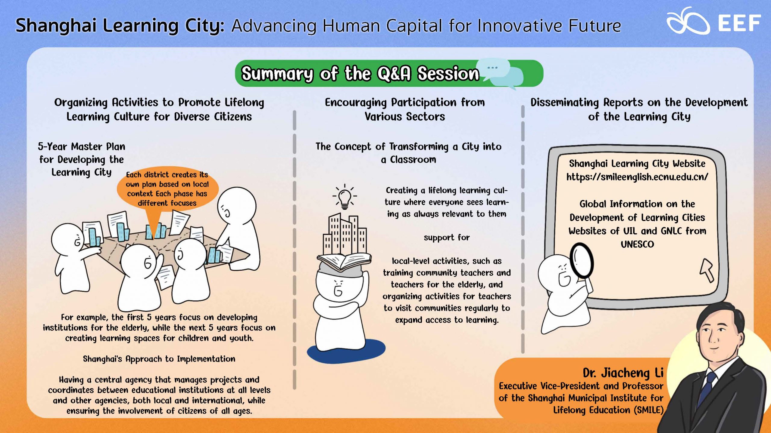 According to Prof. Dr. Jiacheng Li, Executive Vice President and Professor, Shanghai Municipal Institute for Lifelong Education (SMILE), East China Normal University, Shanghai’s learning city is created through strong collaboration between various stake holders, from government agencies, universities, local communities, and NGOs.