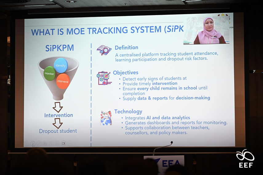 Regional perspectives further enriched the discussion. From Malaysia, Dr. Nik Fatihah Binti Nik Abdullah presented the SiPKPM AI-based early warning system, now used nationwide to predict dropout risks and guide timely, evidence-based support. “The SiPKPM system integrates data on attendance, academic performance, and socio-behavioral indicators to predict learners’ risk of dropping out. It enables targeted support and supports rapid, evidence-based decision-making, replacing guesswork,” said Dr. Nik.